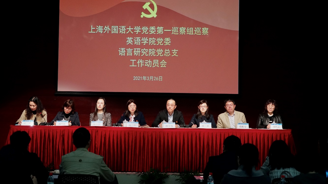 2021年3月26日,上海外国语大学党委第一巡察组巡察英语学院党委、语言研究院党总支工作动员会召开。校党委副书记、纪委书记、巡察工作领导小组副组长钱玲出席并讲话。巡察组组长孙宇伟作动员讲话。英语学院党委书记杨雪莲、语言研究院党总支书记蒋昕宇作表态发言。英语学院院长王欣、语言研究院副院长廖巧云作简要表态。王欣主持会议。党委巡察工作办公室主任姚君君、巡察组副组长麻桑及巡察组全体成员出席会议,英语学院和语言研究院领导班子成员参加会议。英语学院党委委员、纪检委员、党支部书记、系主任、学科带头人、学术委员会委员、党代会代表、教代会代表、工会委员、教师和学生代表、退休人员代表列席会议。语言研究院党总支委员、纪检委员、党支部书记、教研室主任、学科带头人、学位评定分委员会委员、党代会代表、教代会代表、工会委员、教师和学生代表席会议。