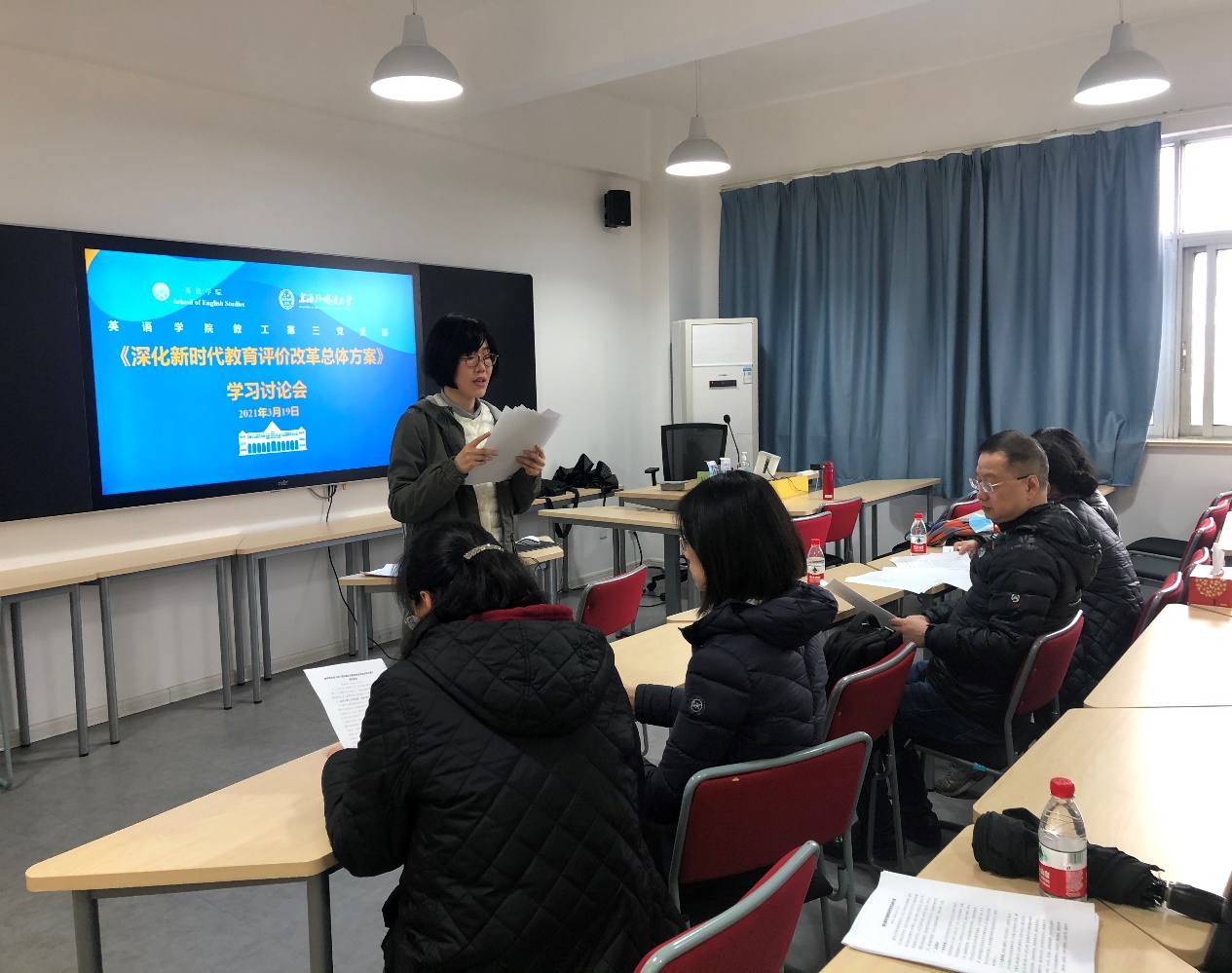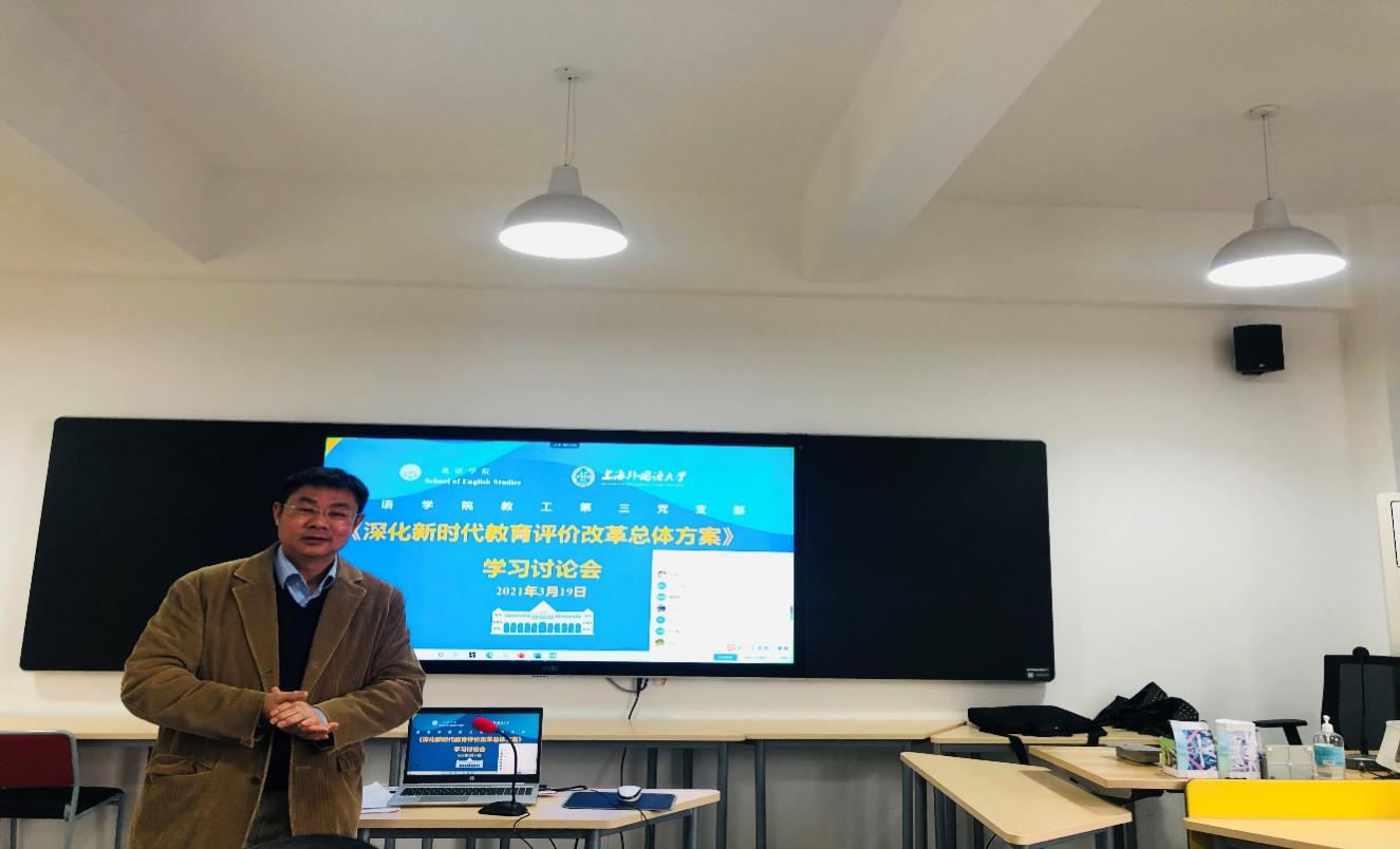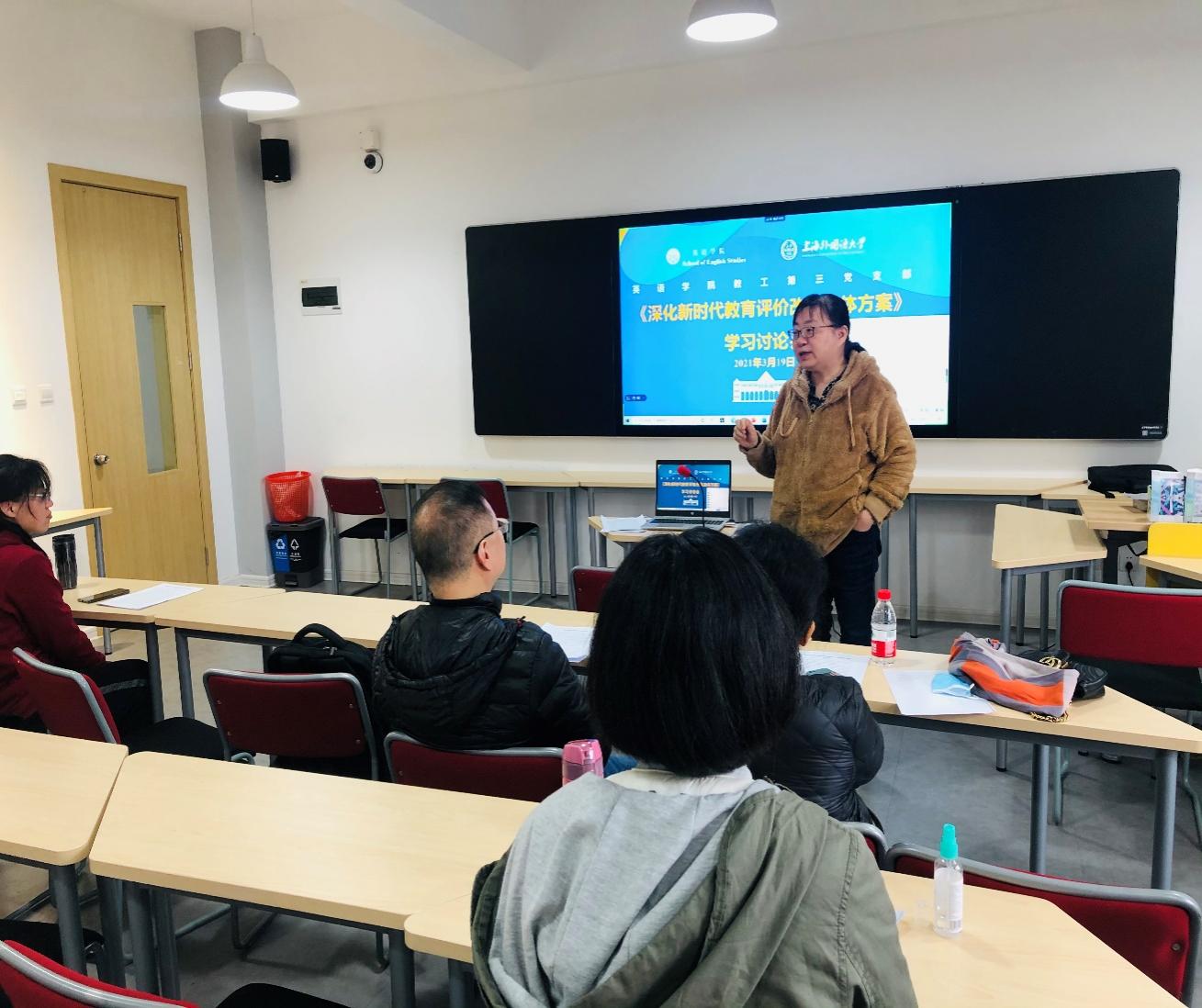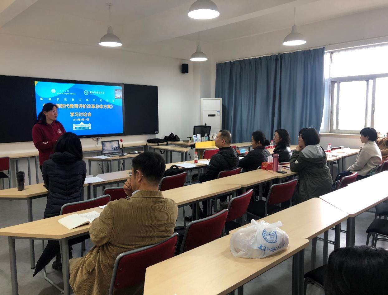 为深入贯彻习近平总书记关于抓好《深化新时代教育评价改革总体方案》落实落地的重要指示精神,进一步落实我校我院教育评价改革工作,2021年3月19日,英语学院教工第三党支部、教工第四党支部组织党员教师参加《深化新时代教育评价改革总体方案》学习讨论会。党支部还邀请了多位非中共党员教师列席,集体学习交流。
