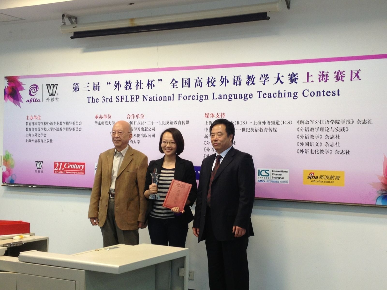 第三届“外教社杯”全国高校外语教学大赛全国总决赛于2012年11月18日至20日在上海外国语大学举行,从全国各省分赛区1000多所参赛高校中脱颖而出的24位分赛区冠军选手汇聚上海外语教育出版社,角逐中国外语专业教学的最高奖项。上海外国语大学英语学院顾秋蓓老师与来自复旦大学,华东师范大学等上海各大高校的英语专业教师通过英语综合课程的授课及说课的同台竞技,以其独特的教学理念,出色的教学设计以及精湛的讲课技艺获得了上海赛区进军全国总决赛的唯一一张入场券,荣获上海赛区一等奖。在之后的全国总决赛中,顾老师以授课分数全场最高分的好成绩荣获总决赛二等奖。