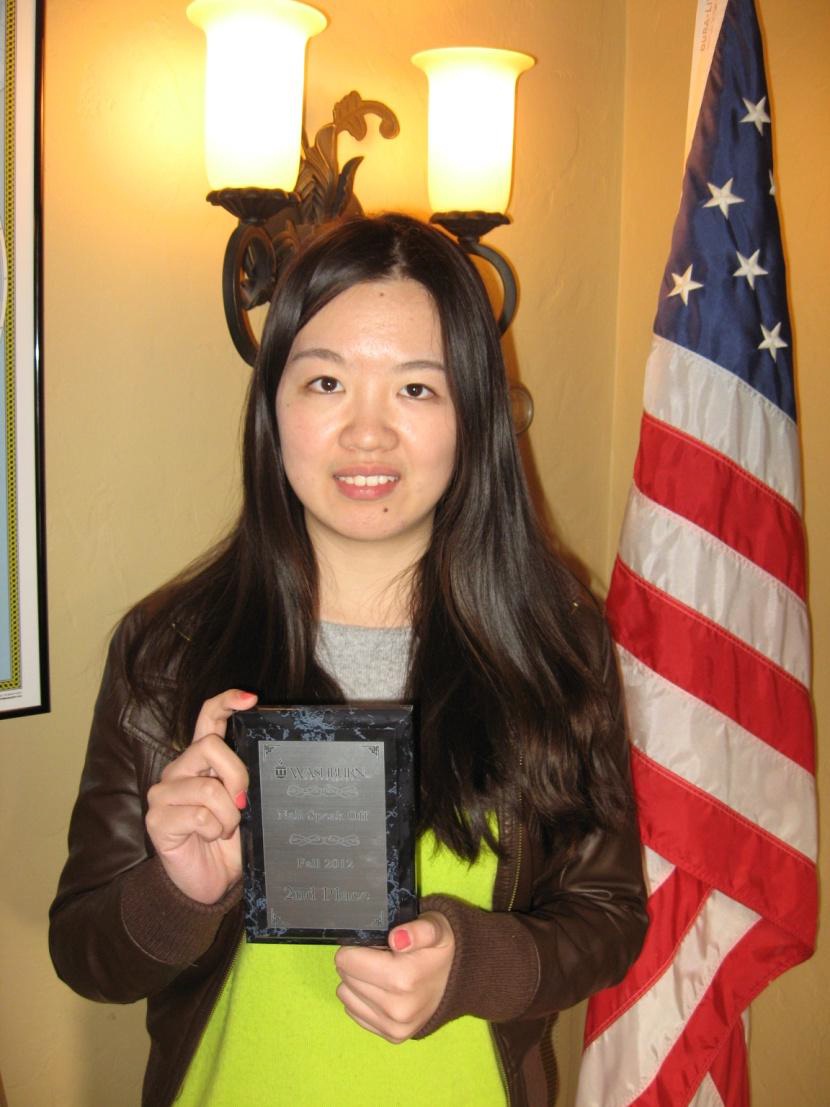 2012年12月,我院2010级国公班学生杜欣卉在美国华盛本大学留学期间,荣获该校组织的Nall Speak Off公共演讲比赛二等奖。杜欣卉的演讲主题为中国饮食文化,结合幻灯片从色香味三部分展开,在与以英语为母语的学生激烈角逐中脱颖而出,取得第二名的好成绩。