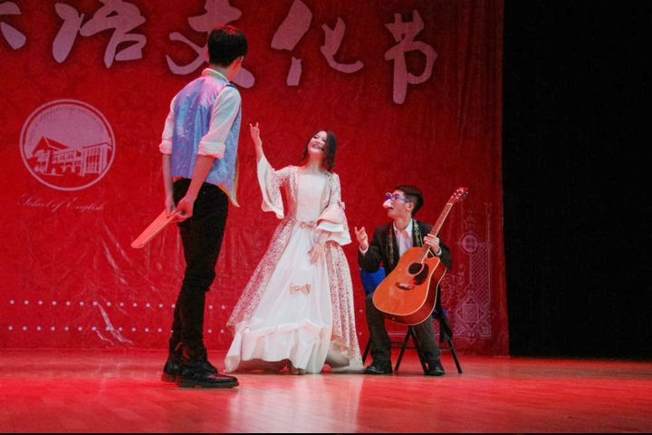 首先登台表演的是喜剧《驯悍记》。人们常说女人如水,但莎翁笔下的凯瑟丽娜却似火,她一身傲气,仿佛嘲笑着世俗男子,嘲笑他们用婚姻、爱情和金钱衡量着人生。拜读经典,由2011级英语语言文学4班、翻译2班和翻译3班组成的《驯悍记》剧组将这一莎翁经典喜剧搬上舞台。经过编剧精心改编,剧组选取男女主人公初见、婚礼和探亲的三幕向大家展现了文艺复兴时期人们的婚姻观与幸福观。全剧最精彩的莫过于硬汉与悍妇的对手戏。为了演好一幕幕驯悍表演,男女主角绞尽脑汁,倾尽全力,表演活灵活现。台上三十分钟,观众阅尽众生百态,殊不知这更是导演、编剧、演员、灯光、道具、场务等几十名同学共同努力的结果。剧终,“猛虎”被驯服,一切辛劳得到回报,似乎皆大欢喜。但智慧如莎翁,欢笑背后留给我们的往往是深刻的思考和感悟。