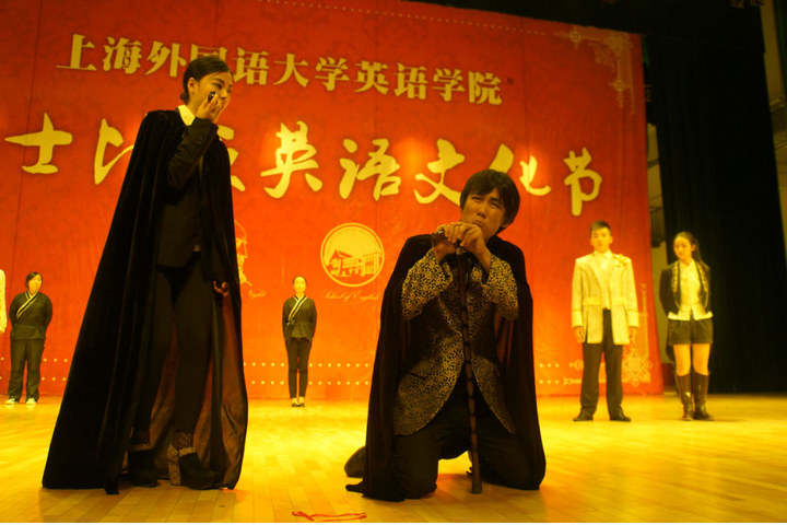 5月30日晚,英语学院第十七届“莎士比亚英语文化节”系列活动之五——“英韵华章”莎士比亚戏剧公演在松江校区教育会堂大礼堂压轴登场。英语学院2011级全体同学倾情奉献,精彩诠释,将莎翁经典剧目《驯悍记》、《奥赛罗》和《第十二夜》搬上了校园舞台。同时,由顾悦老师指导的旨在全方位提高英语学院人文艺术环境,让人文情怀和艺术氛围弥漫课堂内外的“英华人文艺术中心”也正式揭牌成立。莎士比亚戏剧演出迄今已成功举办了十七届,并成为上外乃至全上海高校的校园文化优质品牌。出席当晚公演的嘉宾有英国领事馆文化教育处艺术项目经理张妤女士和教育项目经理徐洵女士,校就业指导中心主任、飞那儿剧团指导教师李然,校团委办公室主任、大学生艺术中心指导刘昊老师。英语学院院长查明建、党总支书记李尚宏、学院近三十位教师和两名外教参加了活动,二年级精读教研组全体教师担当了评委。担任此次演出的指导教师为李然、刘思远、顾悦和李磊四位老师。