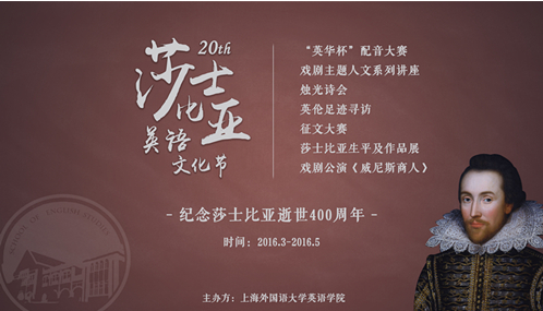 2016年是英语学院“莎士比亚英语文化节”20周年,恰逢莎士比亚逝世400周年,英语学院将开展一系列内容丰富、形式多样的人文活动,使广大同学在英语学习的基础上,感悟西方传统文化之精髓,融汇中外,演绎经典。
