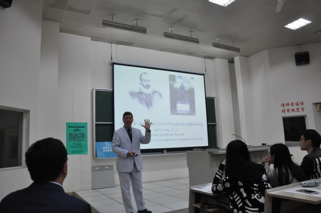 次日晚上,叶扬教授在讲座“Michel de Montaigne and the English Essay”中,为大家深入解读了文艺复兴时期的另一位大师,即法国思想家和作家蒙田和他的随笔录。讲座中,叶教授首先阐述了蒙田及其作品的时代背景,着重讲述了对其创作产生影响的先驱人物,受此影响蒙田不仅成为文艺复兴时代的思想家,而且被认为是现代主义的先驱。之后,叶教授从蒙田的三部代表性随笔散文娓娓道来,分析了蒙田的作品主题、写作特点,列举了其对培根、兰姆、史蒂文森等几代人深远广泛的影响。