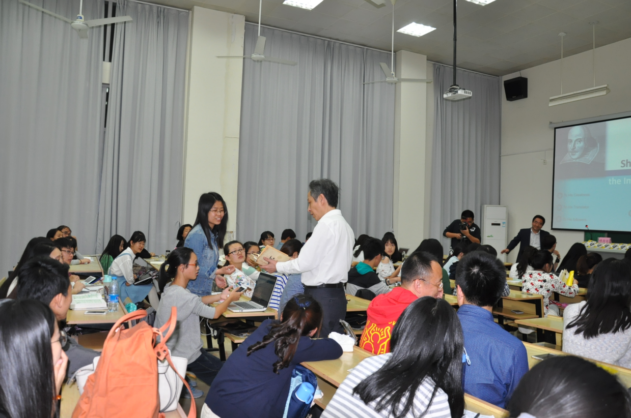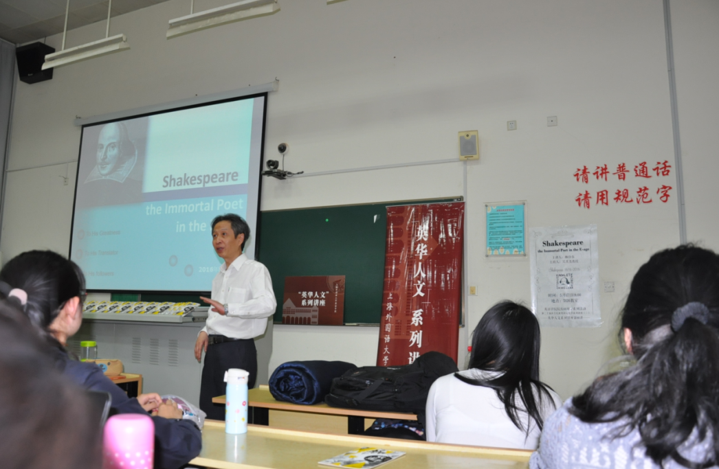 吴其尧教授一番隆重的介绍之后,杨自伍先生以庄重的方式开始了当晚的讲座。杨先生首先向莎士比亚的画像深深鞠躬,并邀请在场师生全体起立向莎士比亚致以崇高的敬意,众人齐声高诵的致词“Glory be to thee, Shakespeare!”响彻教室。随后杨自伍先生以一段气势磅礴,典雅优美的中文开场,赞颂莎士比亚为“天纵诗宗,旷世之才,千载一时,举世仰慕”,称赞其“笔下琳琅世难及,芳声远驰无出右”,以此表达对莎士比亚的敬意,深深地感染了现场的听众们。此外,杨自伍先生还引用诸多文人的话语佐证了莎士比亚在世界文学史上无可比拟的地位,并解释了莎士比亚的中文译文有如此之多的原因。