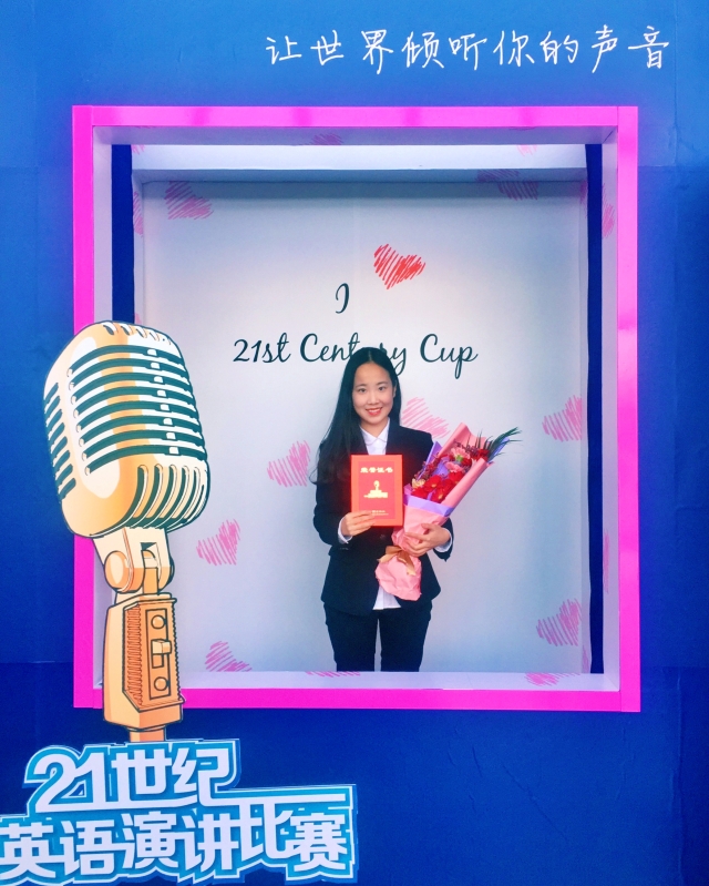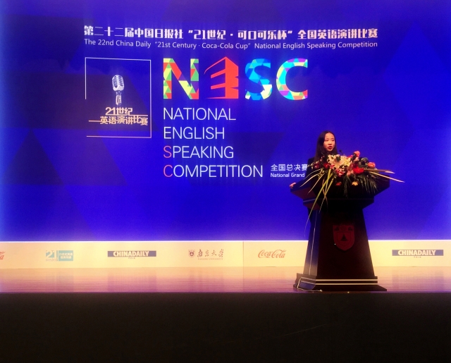 3月26日下午,第22届中国日报社“21世纪·可口可乐杯”全国英语演讲比赛总决赛在南京大学圆满落幕。经过3天的激烈角逐,上海外国语大学英语学院2015级翻译学专业刘心语同学获得全国一等奖的佳绩。