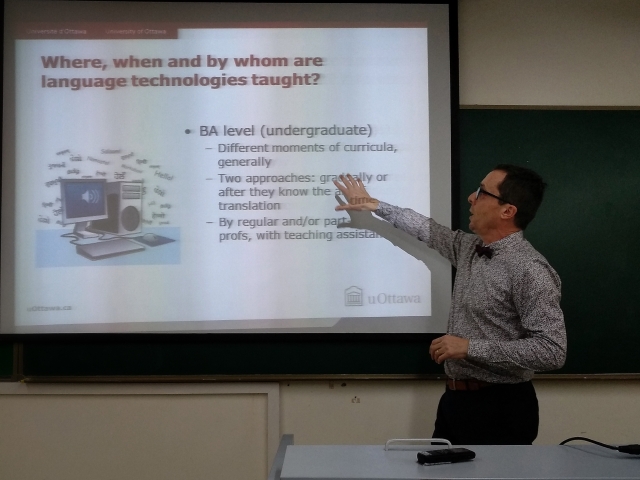 入手,首先介绍了加拿大的翻译教育、翻译产业和翻译研究的现状。1969年的《官方语言法案》把加拿大确定为一个双语国家,这一法案催生了大量的翻译需求,从而推动了加拿大翻译产业、教育和研究的蓬勃发展。渥太华大学作为位于首都的三所高校之一,于1972年率先开设了翻译专业,成为全加拿大第一所开设该专业的高校。随后,Quirion教授又介绍了翻译技术在加拿大的发展。加拿大对翻译技术非常重视,翻译工作者协会规定,如果学生毕业后希望不经过考试就自动获得译者资质认证证书,本科期间就必须学习至少两门(6学分)的翻译技术课程。在介绍渥太华大学笔译与口译学院课程设置的基础上,Quirion教授又特别介绍了该学院由他执教的一门翻译技术方向的暑期特色课程“骑单车、学术语”,最后还介绍了该学院的交换生项目和暑期项目。在提问环节,Quirion教授对师生们提出的“翻译技术是否可以应用于文学翻译?”、“《官方语言法案》诞生的契机”等问题进行了详尽的解答。