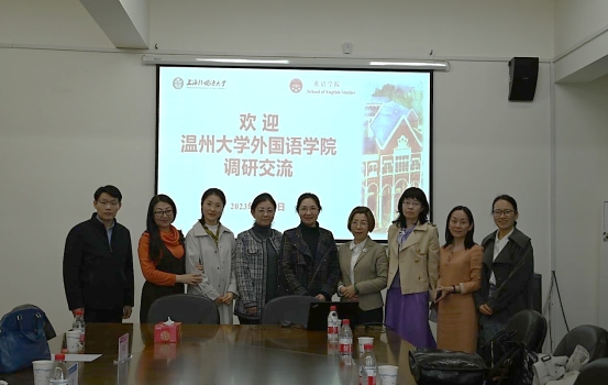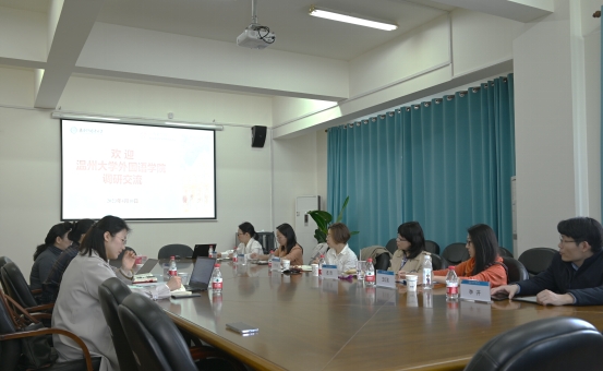 本次交流会谈在学院会议室举行。王欣院长代表学院对温州大学外国语学院的来访表示热烈欢迎,就上外英语学院专业设置和人才培养的基本情况做简要介绍,并分享了我院翻译学科建设及专业特色建设的基本情况。随后肖维青老师分享了我院在翻译教学实践、课程思政建设、学科竞赛等方面的思路举措和实践经验。庄驰原老师介绍了我院学科社团的基本情况以及社团活动和专业培养相结合的人才培养路径。双方还进一步就学科建设、国际合作项目、学生综合能力培养等问题进行了深入细致的交流探讨。