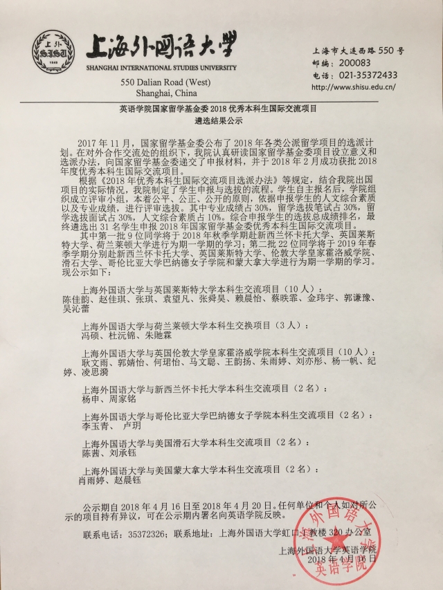 【公示】英语学院国家留学基金委2018优秀本科生国际交流项目遴选结果