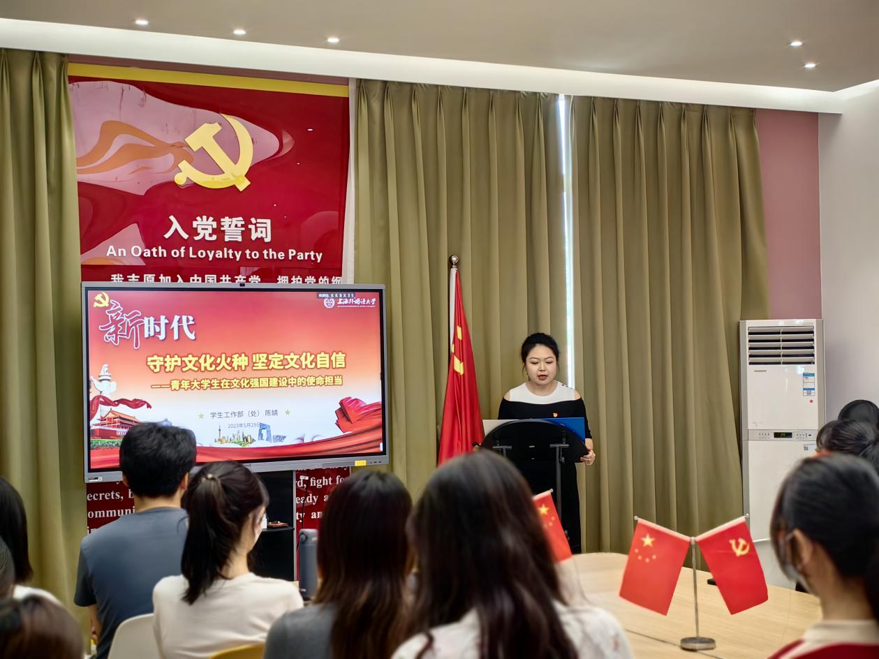 2023529日,英语学院本科生第二党支部邀请学生工作部(处)思政党建中心陈婧老师全体预备党员讲授了《守护文化火种 坚定文化自信——青年大学生在文化强国建设中的使命担当》主题党课。