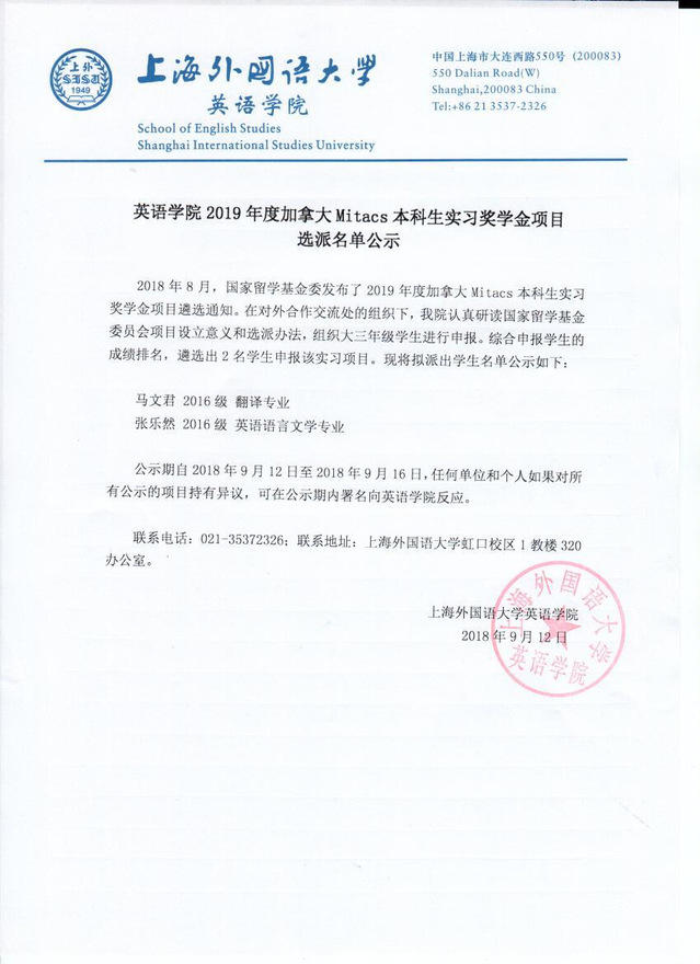 【公示】英语学院2019年度加拿大Mitacs本科生实习奖学金项目选派名单