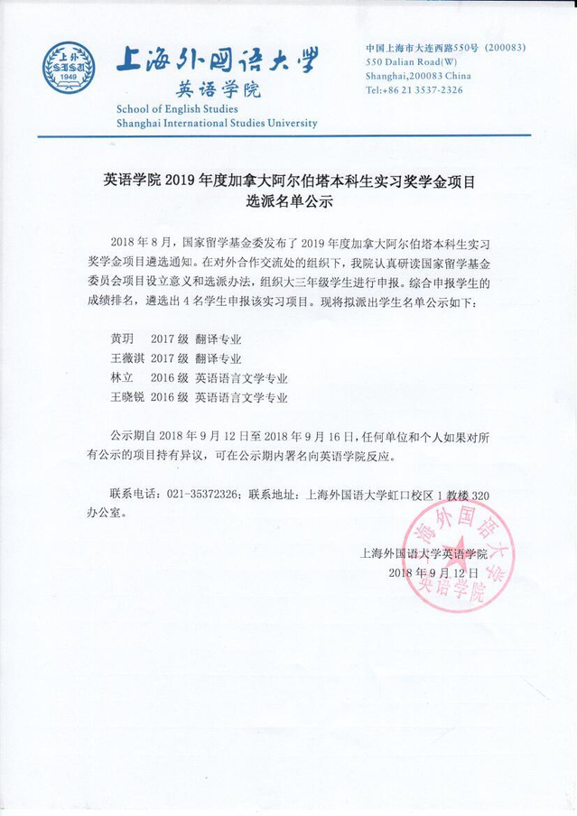 【公示】英语学院2019年度加拿大阿尔伯塔本科生实习奖学金项目选派名单