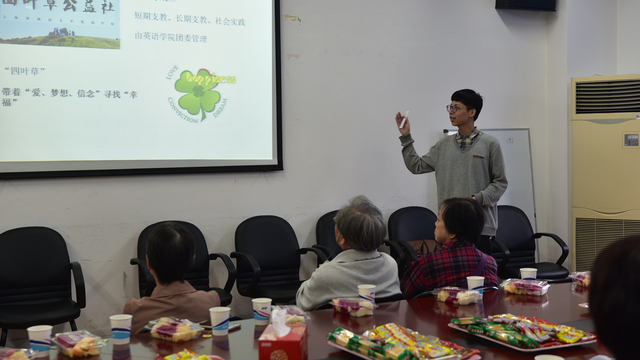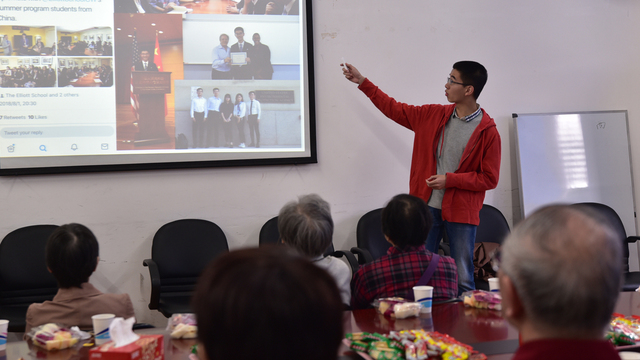 随后,党总支副书记曹原带领三位优秀学生代表分别从不同的角度向老教师们汇报了当今大学生的丰富生活,这一创新的环节将茶话会推向了高潮。首先汇报的是演讲英才熊子卿同学,出身于“上外世家”的他在英语学习、尤其是英文演讲上展现了独特的天赋,曾在上海市及全国的很多英语学科竞赛中争金夺银,并于今年五月在伦敦国际公共演讲比赛(IPSC)中入选全球七强。作为我校首支英文演讲社社长,熊同学汇报了包括演讲社、口译社、英华诗苑、写作工作坊等学院学术社团开展情况,向老教师们展示英华学子在“第二课堂”的灼灼风采。而后,他以一段流利、风趣的即兴英文演讲,展现了他对英语的自如掌控,而他对于人工智能挑战下的英语教育的深入见解,充分体现出了英华学子的青春自信与人文深度。当兵归来的杨佳男同学则以“军营绿与上外蓝的邂逅”为主题,汇报了他在两年的军旅生涯中的心得体悟为他现今大学生活的帮助。杨同学大一刚刚入学便应征入伍,两年后重返校园。在入学的一年里,他始终坚守军人的刻苦和勤奋,连续两个学期获得上外优秀学生奖学金特等奖。作为院党建中心和分团委学生会的学生干部,他积极汇报了学院在学生党建方面的各项工作,并将学生会开展的各类校园活动一一与老教师们汇报,充分展示了英华学子扎实的人文内核和严谨的学术态度。最后做汇报的是来自本科四年级、即将成为支教研究生的王智伟同学。三年以来,王同学曾两次前往四川支教,其负责的创新创业实践项目被评为上海市级“优秀”项目。热心公益的王同学向老教师们汇报了学院下属的四叶草等八支暑期支教队的实践活动,以自身的经历生动呈现了支教学生的收获和感动。三位同学的汇报向老教师们展现了学院为学生们打造的第一课堂之外的实践平台,也展现了英华学子在社团、军营、学生会和公益实践中的成长收获和责任担当。