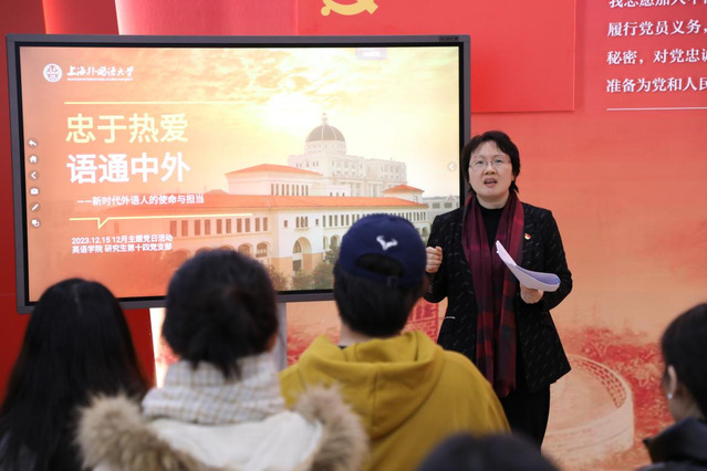 1215日,副校长张静英语学院研究生第十四党支部的党员同学们共同探讨了这一话题。本次“忠于热爱 语通中外”主题党日活动由支部书记颜若偃主持,专职组织员张文洁、教工第二党支部书记宋亮观摩学习。
