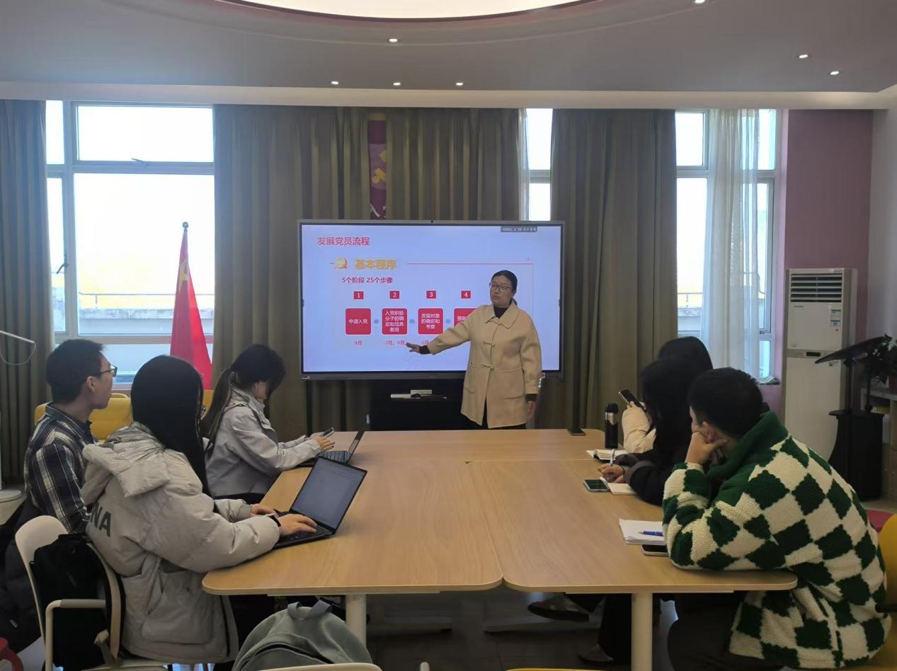 张文洁老师以“高标准、严要求做好发展党员和支部手册撰写”为题,开展了党务能力提升专题培训。张老师结合《中国共产党发展党员工作细则》《上海外国语大学发展党员工作手册》等文件,详细介绍了党员发展全过程的步骤,一一解读了材料撰写的相关要求,并就同学们提出的问题进行解答。结合党支部全年工作要点,张老师向同学们解读了学生党支部的职责与作用、“三会一课”的具体要求、党员管理的详细要点,并培训了党支部工作记录本的撰写规范。张老师希望新生党支部能够充分调动各支委与党员的积极性,结合专业自身特长,打造支部党建品牌,积极发挥支部的战斗堡垒作用和党员的模范带头作用。