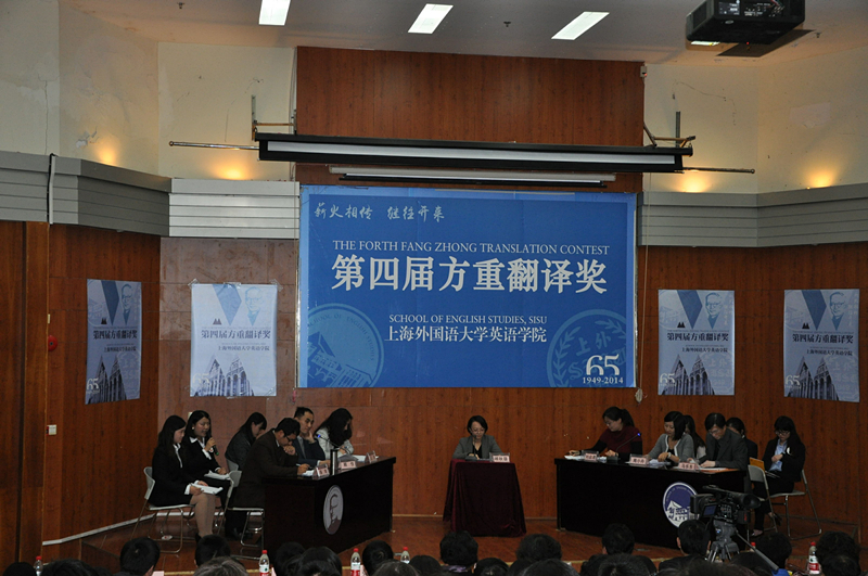 时值校庆65周年之际,英语学院隆重举办第四届“方重翻译奖”口译表演赛暨颁奖典礼。12月2日晚,松江校区图文东厅内座无虚席,济济一堂。上海外国语大学党委书记姜锋书记,外事处处长张红玲教授,国际交流学院院长张艳莉教授,高翻学院院长张爱玲教授,文学研究院副院长张和龙教授,教务处副处长张廷佺教授、赵美娟副教授、孙建副教授,外教社黄卫副总编辑,国际工商管理学院副书记徐永副教授,高级翻译学院副院长吴刚副教授,国际教育学院院长助理田小勇老师等应邀前来观摩了口译表演赛。英语学院院长查明建教授,党总支书记孙俭老师,副院长刘全福教授、许立冰副教授以及邹申教授、张群教授、徐海铭教授、张雪梅教授、王欣教授等数十位教师出席了颁奖典礼。我校各学院的学生以及国际交流学院留学生、中国学专业研究生等三百多位同学参加了此次典礼。