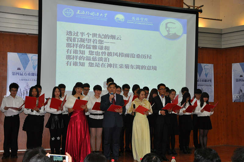 译比赛结束后,英语学院高健、蓝茹老师和学生朗诵了查明建院长创作的诗歌《我们的方重》。该诗回顾了方重先生求学、治学、教学的人生历程,颂扬了方重先生伟岸的人文品格和治学精神。朗诵者饱含深情,声情并茂:“今晚,我们以您的名义在这里集结/迎接您重返英华/迎接您——/从1902年的金秋走来/从清华学校走来/从斯坦福、伯克利走来/从珞珈山走来/从剑桥走来/从莎士比亚剧作中走来/从《乔叟文集》中走来/从陶渊明诗文中走来/从65年的校史中走来”,表达了对方重先生无限的敬仰和深切的怀念,感人至深。诗歌最后“虽不能至,心向往之!”一唱三叹,久久回荡,令人动容。