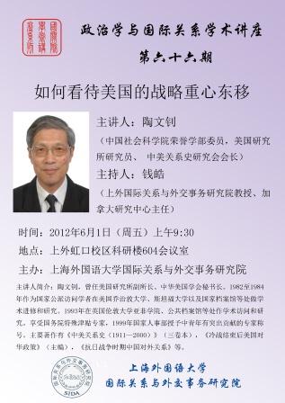 陶文钊,中国社会科学院荣誉学部委员,美国研究所研究员、中美关系史研究会会长。曾任美国研究所副所长、中华美国学会秘书长。1982至1984年作为国家公派访问学者在美国乔治敦大学、斯坦福大学以及国家档案馆等处做学术进修和研究。1993年在英国伦敦大学亚非学院、公共档案馆等处作学术访问和研究。享受国务院特殊津贴专家,1999年国家人事部授予中青年有突出贡献的专家称号。