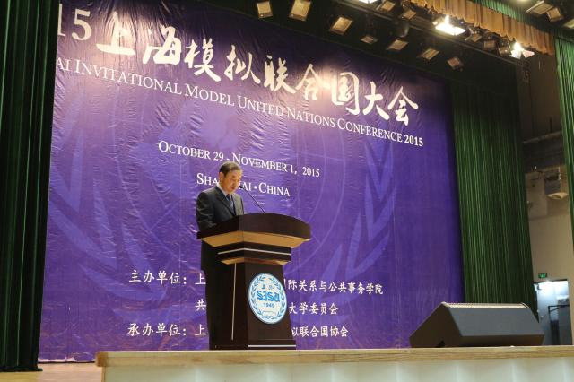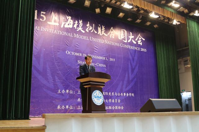 2015年10月29日,2015上海模拟联合国大会在上海外国语大学松江校区教育会堂隆重召开,上海市政协常委、对外友好委员会主任道书明,市政协对外友好委员会专职副主任孙小双、上海市人民代表大会外事委员会办公室副主任罗杰、上海外国语大学国际关系与公共事务学院院长郭树勇教授、上外团委副书记田昊罡及国关学院各年级辅导员等出席了大会开幕式。