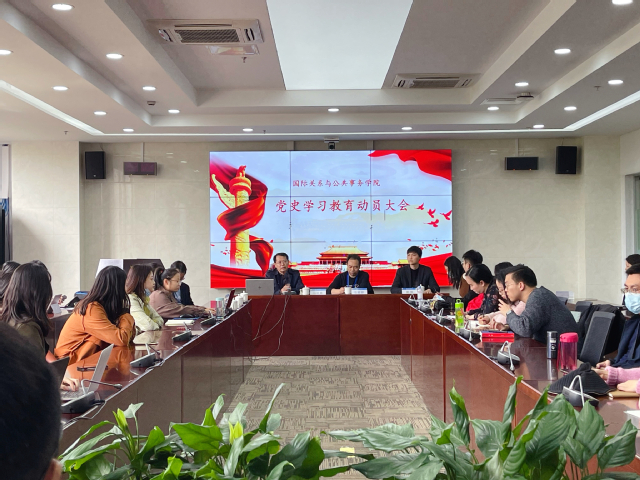 4月6日上午,国际关系与公共事务学院党史学习教育动员大会在国际教育中心二楼会议室召开,学院党委书记张绍铎、院长郭树勇、党委副书记蒋灏、副院长晋继勇及各党支部委员、教工、学生支部党员代表、入党积极分子代表参加了此次会议,会议由院长郭树勇主持。