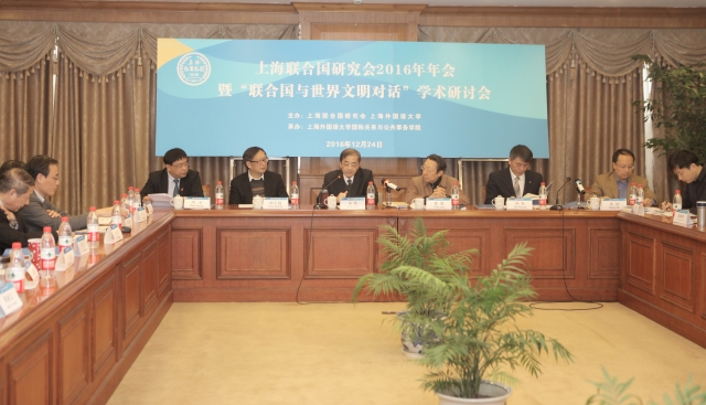 2016年12月24日,由上海外国语大学与上海联合国研究会主办、上海外国语大学国际关系与公共事务学院承办的上海联合国研究会2016年年会暨“联合国与世界文明对话”学术研讨会在上海外国语大学虹口校区会议中心英伦厅举行。