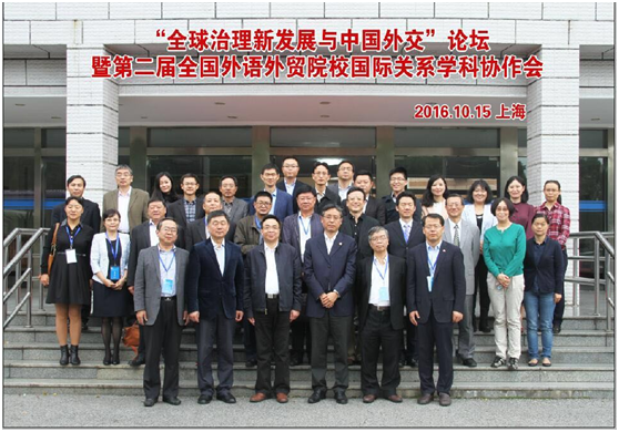 2016年10月15日, “全球治理新发展与中国外交”论坛暨第二届全国外语外贸院校国际关系学科协作会在上海外国语大学国际关系与公共事务学院举行。出席开幕式并讲话的专家有上海外国语大学党委书记姜锋、外交部政策规划司副司长黄峥、上海社会科学院副院长黄仁伟研究员、教育部政治学专业教学指导委员会副主任委员陈岳教授,以及来自全国15所外语外贸大学的国际关系学科负责人。