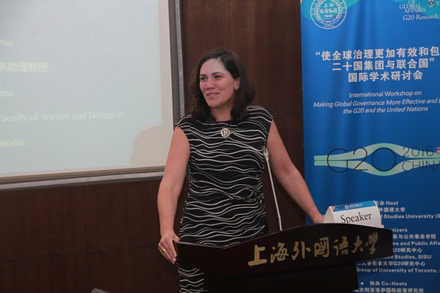 第一专题讨论为G20与联合国的关系,复旦大学张贵洪教授主持。上海国际问题研究院全球治理研究所张海冰研究员、澳大利亚邦德国际关系学院系助理教授Caitlin Byrne、复旦大学国际关系与公共事务学院朱杰进副教授、加拿大多伦多G20研究中心Ella Kokotsis 分别就“G20与联合国2030可持续发展议程”、“提升G20的公共外交能力:联合国的经验”、“联合国2030发展议程与G20机制转型”、“G20与联合国在全球气候治理中的关系”等做主题发言。
