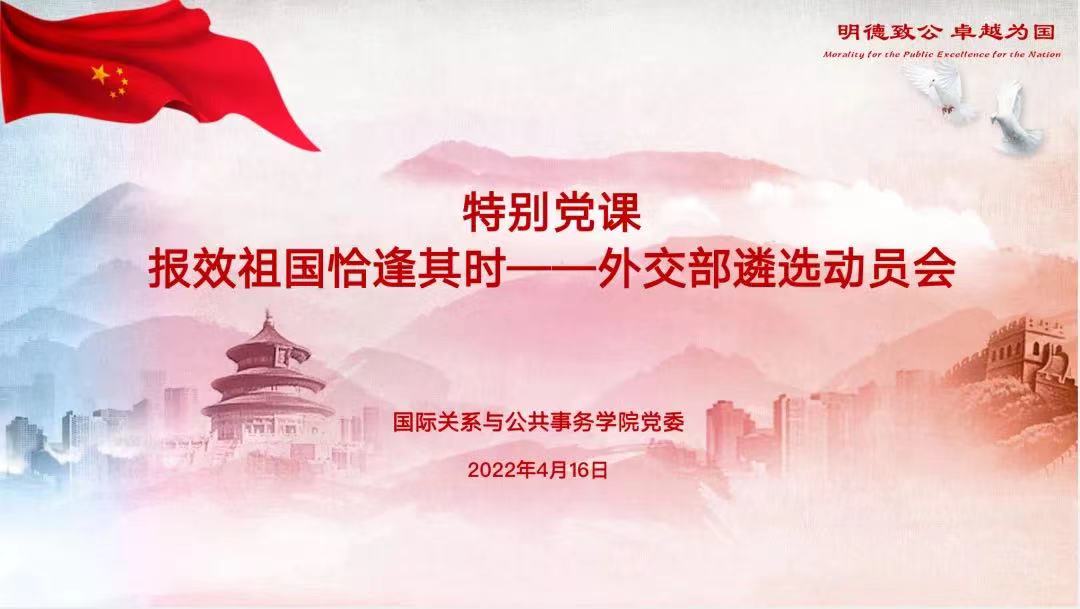 4月16日上午,国际关系与公共事务学院党委举办了名为“报效祖国恰逢其时”的线上特别党课,鼓励广大学子投身祖国的外交事业,同时为本年度的外交部遴选动员誓师。此次动员会邀请了在外交部就职的优秀校友与同学们展开交流,以学院党委书记张绍铎老师与校友对话的形式进行,气氛轻松愉快,互动活跃。