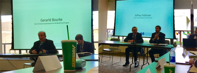 (左图为联合国开发计划署政治事务处副秘书长Jeffrey Feltman谈联合国调停,右图为联合国粮食计划署高级联络官Gerarld Bourke谈粮食安全问题)