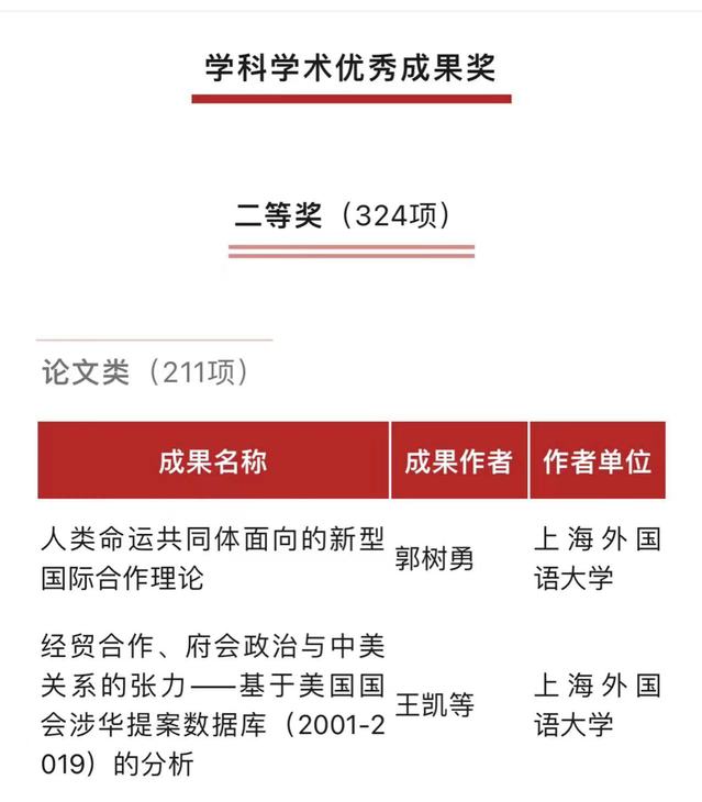 近日,上海市第十六届哲学社会科学优秀成果奖获奖名单公示,我院教师共有两项论文成果获得学科学术优秀成果奖(论文类)二等奖,分别是郭树勇教授的论文《人类命运共同体面向的新型国际合作理论》,和教师王凯与朱昀晖、张绍铎副教授合著的论文《经贸合作、府会政治与中美关系的张力——基于美国国会涉华提案数据库(2001-2019)的分析》。