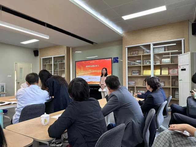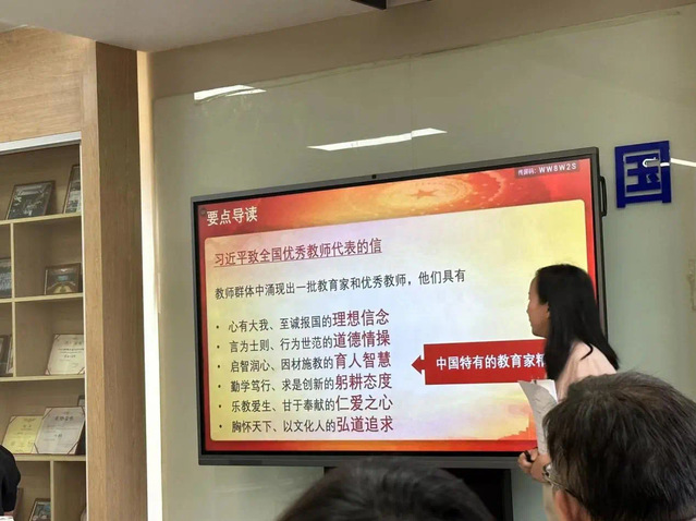 在学习过程中,徐老师对习近平总书记教师节重要指示精神进行领学,重点解读习近平致全国优秀教师代表的信中提出的弘扬教育家精神。徐老师联系习总书记的教书育人观不断丰富的历程,从四有好老师、到四个引路人、到经师人师相统一、做学生为学、为事、为人的大先生,指出中国特有的教育家精神是对上述教书育人观的高度凝练和进一步深化,充分体现了习总书记对教师队伍的关切与要求,最后,徐老师总结了弘扬教育家精神的重要意义。