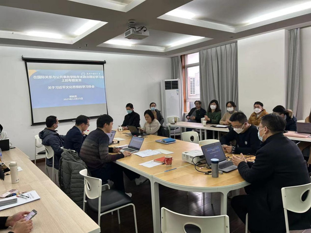 2023年12月15日,国际关系与公共事务学院在虹口校区6号楼604会议室召开教师政治理论学习会议,由党委书记张绍铎主持,院长郭树勇教授作关于习近平文化思想学习体会的主题发言。