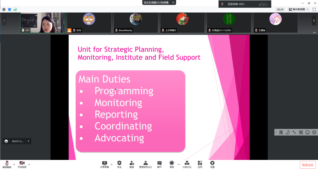 讲座开头,顾诗婷介绍了联合国的组织架构、人事结构以及她的日常工作。顾诗婷于2016年进入教科文巴黎总部的教育部门工作,在完成一年的培训生项目后,作为顾问在教科文教育部门留任。她在2018年合同结束后选择回国。两年后,她竞聘成功并再次回到教科文总部,担任教育部门初级专业人员(JPO)至今。