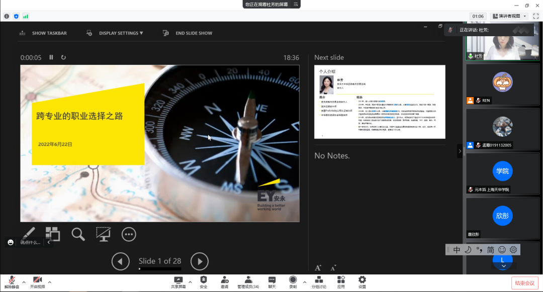 6月22日,国关学院“枝叶关情”系列讲座第七讲邀请到了上外2005届校友,现任安永战略与交易咨询合伙人的杜芳,分享她从上外毕业后跨专业的职业选择道路。