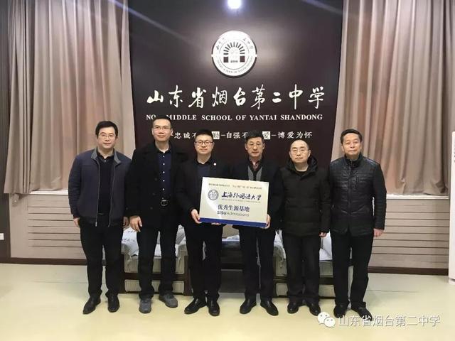 在烟台二中,副校长张仁平、纪委书记陈立新、校长助理教导处主任于志高参加授牌仪式并与上外领导座谈。副校长张仁平介绍了烟台二中悠久的历史以及办学特色,表达了希望输送更多学生到上海外国语大学深造的愿望。
