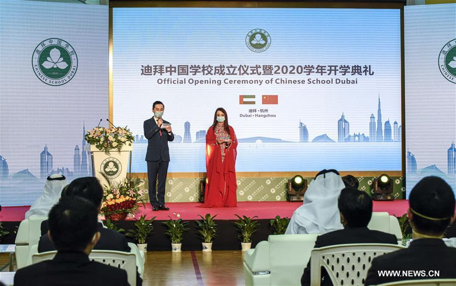 في الصورة الملتقطة أول سبتمبر 2020، حفل افتتاح المدرسة الصينية في دبي بالإمارات. افتتحت المدرسة الصينية، التي تعد أول مدرسة عامة صينية تعمل بدوام كامل خارج الصين، في دبي.