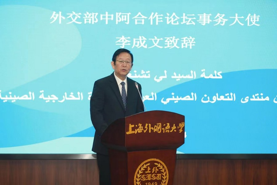 لي تشنغ ون، سفير شؤون منتدى التعاون الصيني العربي بوزارة الخارجية الصينية يلقي كلمة خلال حفل الافتتاح للدورة الدراسية. (صورة مقدمة من مركز الدراسات الصيني العربي للإصلاح والتنمية)
