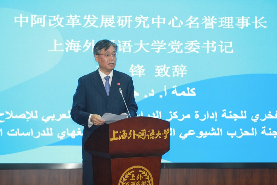 جيانغ فنغ، الرئيس الفخري للجنة إدارة مركز الدراسات الصيني العربي للإصلاح والتنمية وسكرتير لجنة الحزب الشيوعي الصيني بجامعة شانغهاي للدراسات الدولية، يلقي كلمة خلال حفل الافتتاح للدورة الدراسية. (صورة مقدمة من مركز الدراسات الصيني العربي للإصلاح والتنمية)