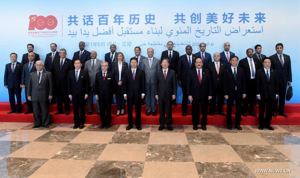 (في الصورة الملتقطة يوم 3 يونيو 2021، سفراء عرب يحضرون نشاطا تبادليا للتعرف على تاريخ الحزب الشيوعي الصيني، يلتقطون صورة مع مسؤولين صينيين في مقاطعة خبي شمالي الصين. زار المبعوثون الدبلوماسيون لـ20 دولة عربية وممثلون لجامعة الدول العربية، مقاطعة خبي شمالي الصين يوم الخميس للمشاركة في أنشطة للتعرف على تاريخ الحزب الشيوعي الصيني.)