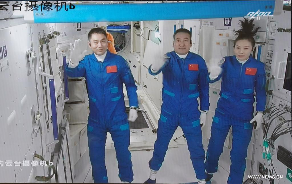 في الصورة الملتقطة من شاشة في داخل مركز التحكم الفضائي ببكين يوم 16 أكتوبر 2021، رواد الفضاء الثلاثة: تشاي تشي قانغ (في الوسط) و وانغ يا بينغ (في اليمين) و يه قوانغ فو، يلوحون بأيديهم بعد دخولهم الوحدة الأساسية "تيانخه" لمحطة الفضاء.