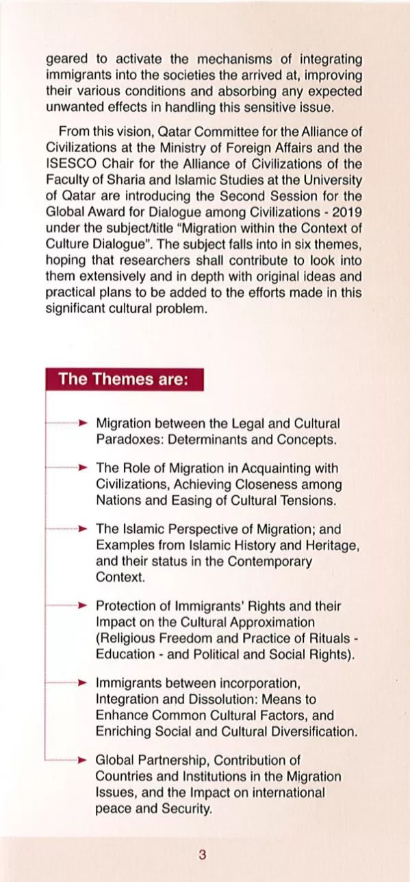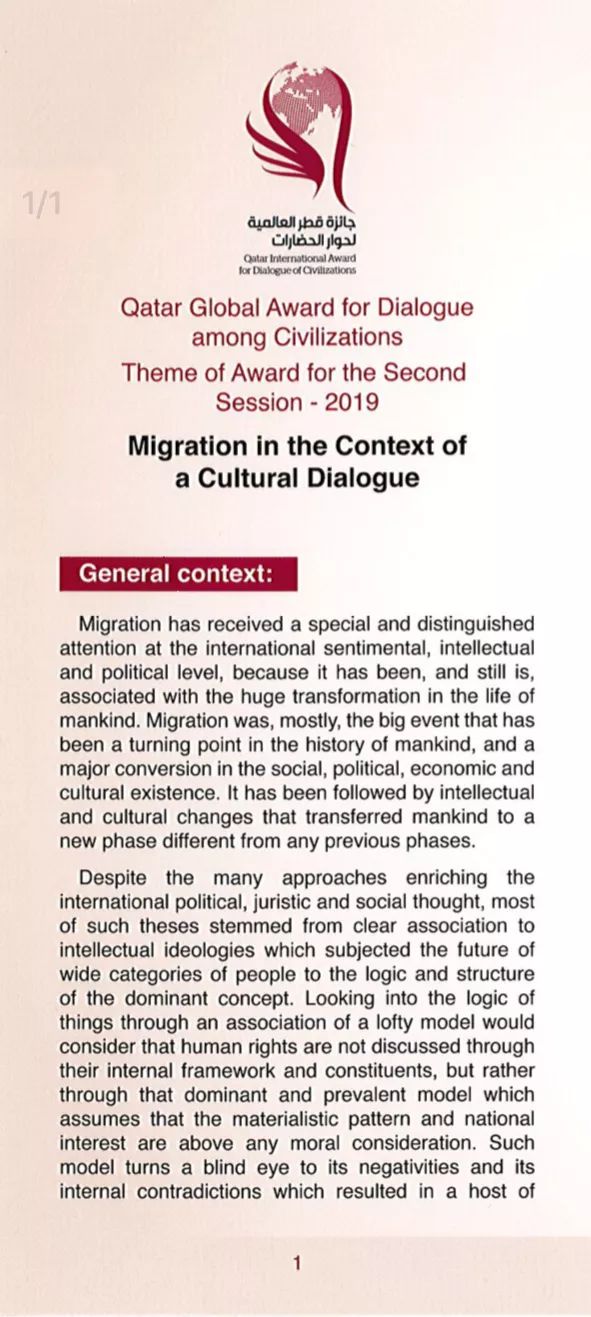 وضمن هذه الرؤية، فإن اللجنة القطرية لتحالف الحضارات بوزارة الخارجية القطرية، وكرسي الإيسيسكو لتحالف الحضارات بكلية الشريعة والدراسات الإسلامية في جامعة قطر، يطرحان موضوع الدورة الثانية لجائزة قطر العالمية لحوار الحضارات، لعام 2019، بعنوان “ملف الهجرة في سياق الحوار الحضاري” في ستة محاور، مع الأمل في أن يسهم الباحثون في بحثها باستفاضة وعمق لبلورة أفكار أصيلة وخطط عملية تضاف إلى الجهود المبذولة في هذا الإشكال الحضاري الكبير.