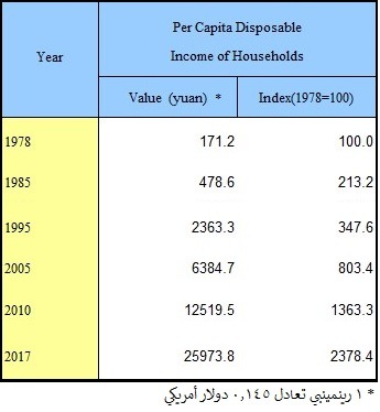 وعلى ذكر الدخل فهي مؤشر جيد لقياس “الطفرة” التي أحدثتها سياسات الصين المتعاقبة لرفع مستوى المعيشة لمواطنيها، فالجدول التالي يبين ارتفاع متوسط الدخل من 171.2 “رينمينبي” في عام 1978 الى 25973.8 ألف “رينمينبي” في العام 2019 (National Bureau of Statistics of China، 2018) – أو ما يقدر بـ(151) ضعف الدخل في 40 عاماً-