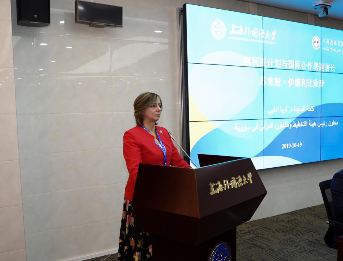 أعرب د. ثريا أدلبي نائبة رئيس هيئة التخطيط والتعاون الدولي السورية عن شكرها الجزيل لوزارة الخارجية الصينية ووزارة التربية والتعليم الصينية وحكومة بلدية شنغهاي وجامعة شنغهاي للدراسات الدولية. شكرت الحكومة الصينية على دعمها لسيادة سوريا ووحدة أراضيها، وأضافت أن الصين ستكون واحدة من أهم شركاء سوريا الدوليين في المرحلة القادمة أي مرحلة إعادة الإعمار. التقت استراتيجية الرئيس بشار أسد التي تقوم على التوجه شرقاً مع المبادرة الصينية "الحزام والطريق"، وسيتعاون الجانبان في مجال بناء البنية التحتية في المستقبل.