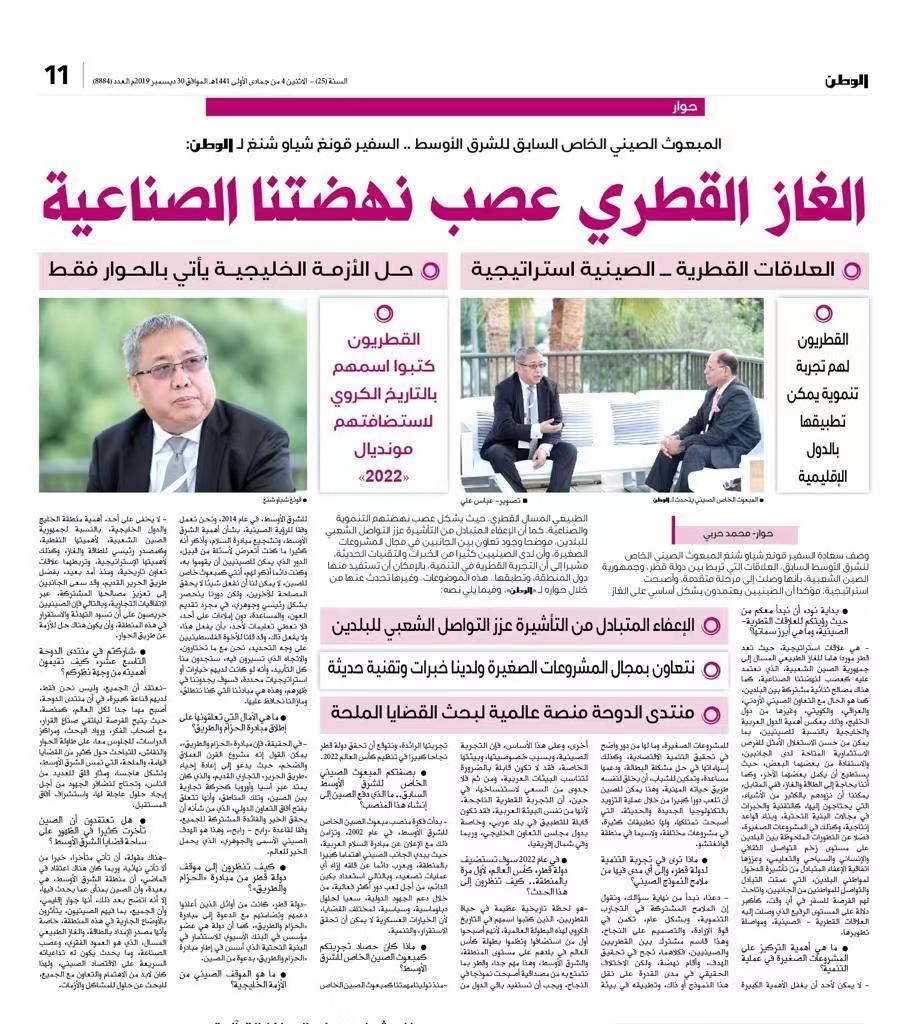 المقابلة بين السفير قونغ شياو شنغ المبعوث الصيني الخاص للشرق الأوسط السابق وصحيفة الوطن الكويتية: