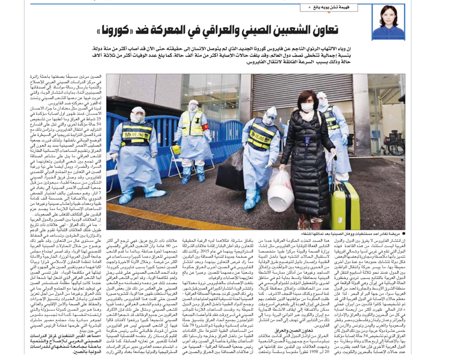 إن العلاقات الودية بين الصين والدول العربية - بما في ذلك العراق - لهي علاقات ذات تاريخ طويل، فتلك العلاقات الثنائية تقوم على الدعم والمؤازرة بين الطرفين، وتساعد في الحفاظ على مستوى عال من التعاون، وقد ظهر ذلك بوضوح من خلال المحاولات الصينية العربية للتصدي لهذا الوباء، وقد أصدر اجتماع مجلس جامعة الدول العربية لوزراء الخارجية والأمانة العامة لمنظمة التعاون الإسلامي قرارا وبيانًا اكدا فيهما دعم وتقدير الصين على الجهود التي تبذلها في مكافحة الوباء، فلن تنسى الصين أبدا الشعب العراقي الذي أشعل لها شمعة أمل عندما كانت لياليها مظلمة، فستستمر الصين في توطيد تعاونها مع المجتمع الدولي بما في ذلك العراق وغيرها من الدول من أجل تعزيز التعاون وتبادل الخبرات وتنسيق الإجراءات والحفاظ على الصحة والأمن الإقليمي والعالمي، وهذا هو دور الصين كدولة مسؤولة والذي ارتضته لنفسها، كما أنه تجسيد ملموس لجوهر مبادرة بناء مجتمع مصير مشترك للبشرية التي طرحها فخامة الرئيس الصيني شي جين بينغ .