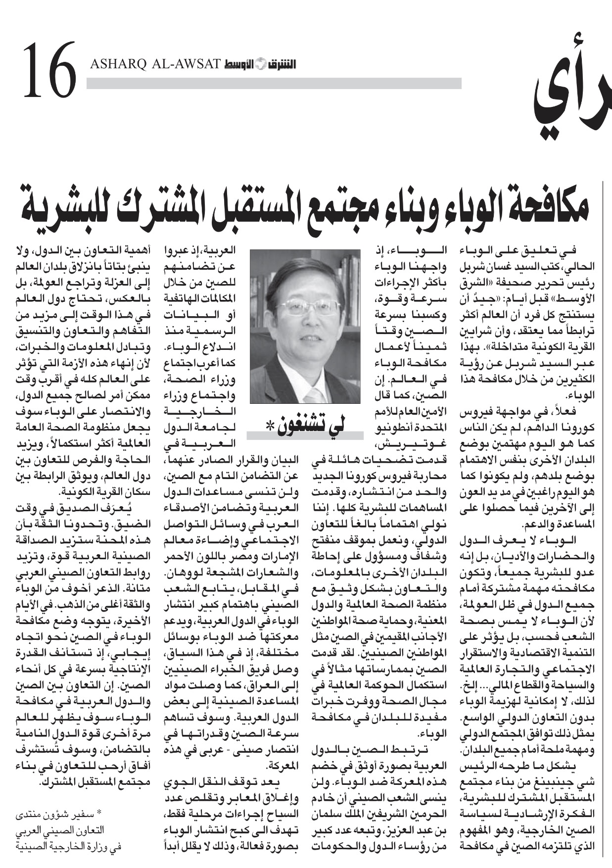 أصدر سفير شؤون منتدى التعاون الصيني العربي في وزارة الخارجية الصينية السفير لي تشنغ ون مقالة بعنوان "مكافحة الوباء وبناء مجتمع المستقبل المشترك للبشرية" في صحيفة الشرق الأوسط، والنص كما يلي: