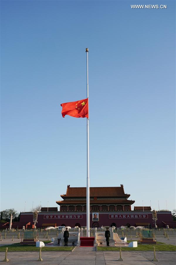 في الصورة الملتقطة يوم 4 أبريل 2020، تنكيس العلم الوطني في ميدان تيان آن من ببكين حدادا على الشهداء الذين قضوا خلال مكافحة مرض فيروس كورونا الجديد (كوفيد-19)، والمواطنين الذين فقدوا أرواحهم جراء الوباء.