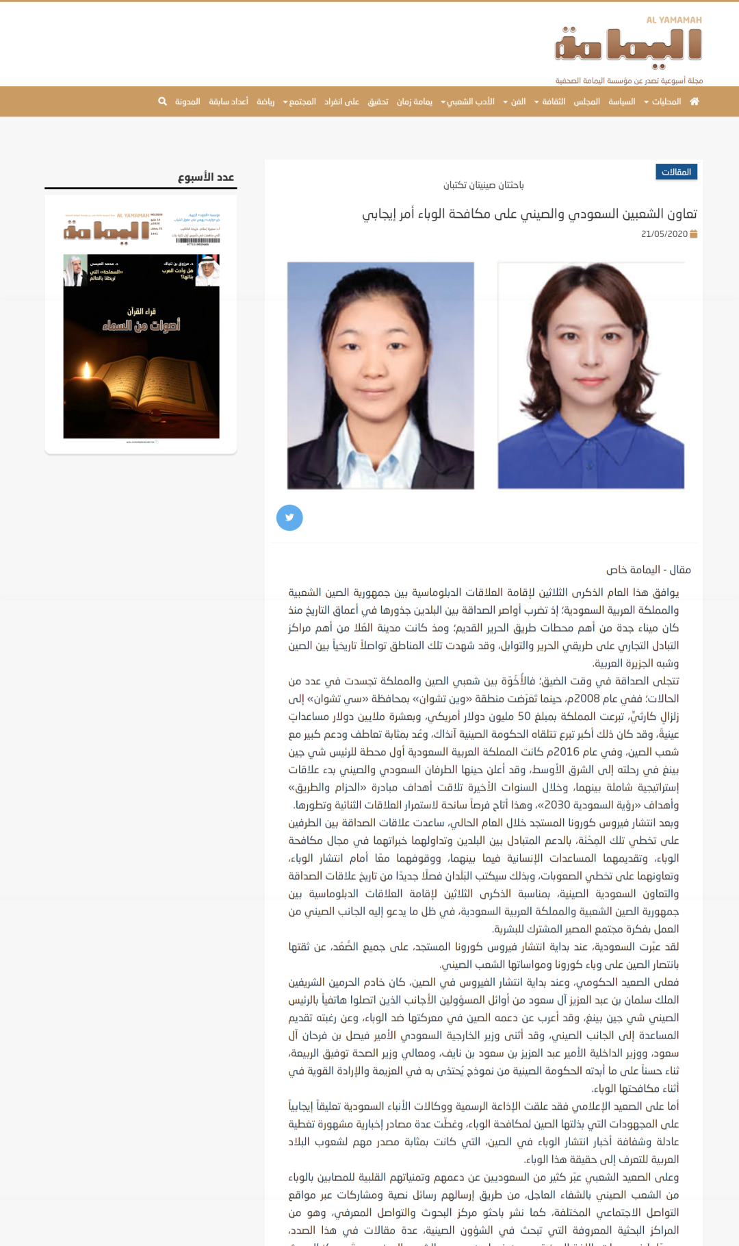 أصدر باحثة المركز تشن يويه يانغ والباحثة المساعدة لي شيو تينج مقالة تحب عنوان " تعاون الشعبين السعودي والصيني على مكافحة الوباء أمر إيجابي" في مجلة اليمامة السعودية. والنص كما يلي: