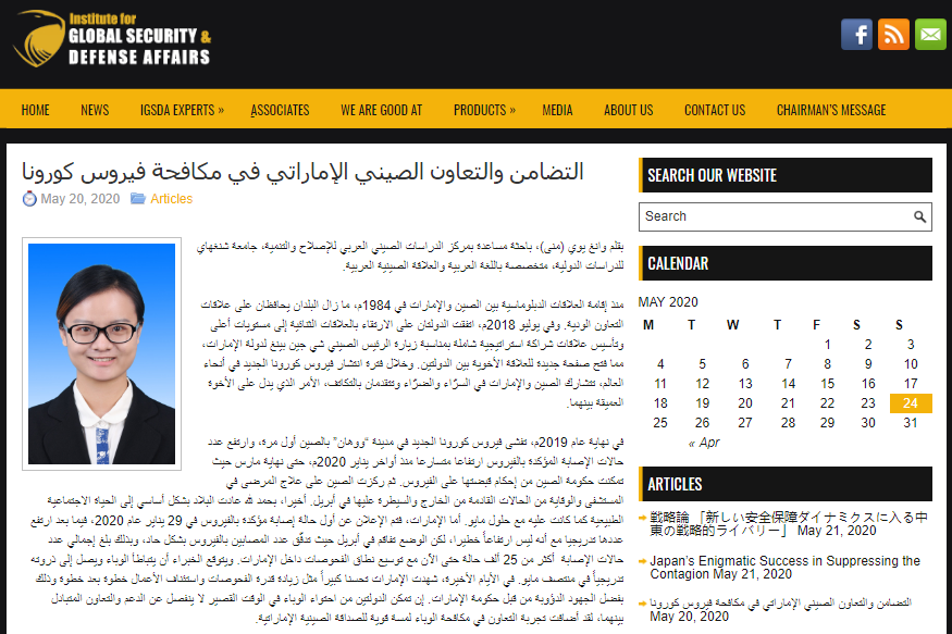 أصدر الباحثة المساعدة في المركز وانغ يوي مقالة تحب عنوان " التضامن والتعاون الصيني الإماراتي في مكافحة فيروس كورونا" في موقع مركز دراسات شؤون الأمن العالمي والدفاع. والنص كما يلي: