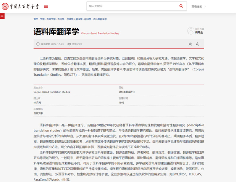 Prof. Hu Kaibao from ICSA at SISU contributes the entry of corpus translation studies in Encyclopedia of China